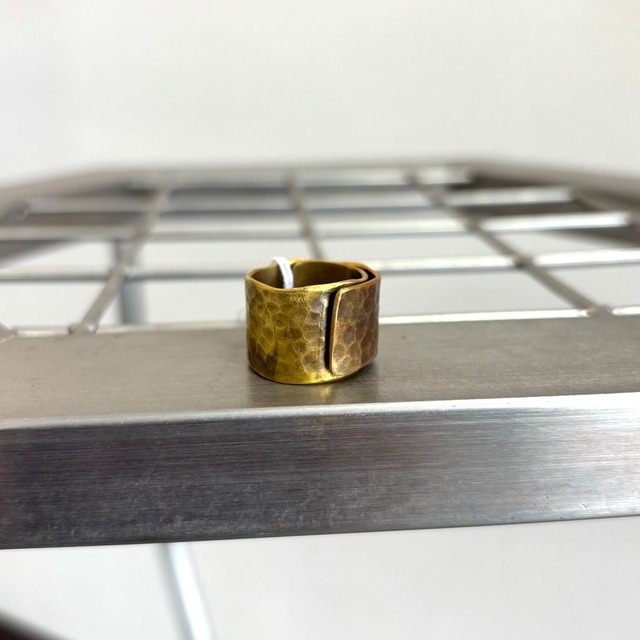 【Brass Ring – 真鍮リング】 しっかりとした太さと、ぐるりと巻いたようなフォルムが印象的な真鍮のリング。 表面には槌目(つちめ)模様が施されており、無骨さと繊細さを併せ持った存在感のある一点です。 真鍮ならではの深みのある輝きに加え、うっすらと色づいた表面も特徴のひとつ。 ※この色味は、貴金属用クロスなどで磨くと落ちてしまうため、現在の風合いをそのままお楽しみいただくのがおすすめです。 【サイズ】 17号 【素材】 真鍮 【お手入れについて】 真鍮は、空気や肌に触れることで少しずつ色味が深まり、経年変化を楽しめる素材です。 使い込むうちに手の皮脂がなじみ、落ち着いた風合いへと変化していきます。 元の輝きを取り戻したい場合は、貴金属用クロスやセーム革(鹿皮など)でやさしく拭くことで、表面の酸化膜を取り除くことができます。 ※ただし、色づいた風合いを保ちたい場合は、磨きすぎにご注意ください。 真鍮ならではの味わいの変化を、ぜひ長くお楽しみください。 —— 作家:Naruse Eri Instagram:@itoeri1982
