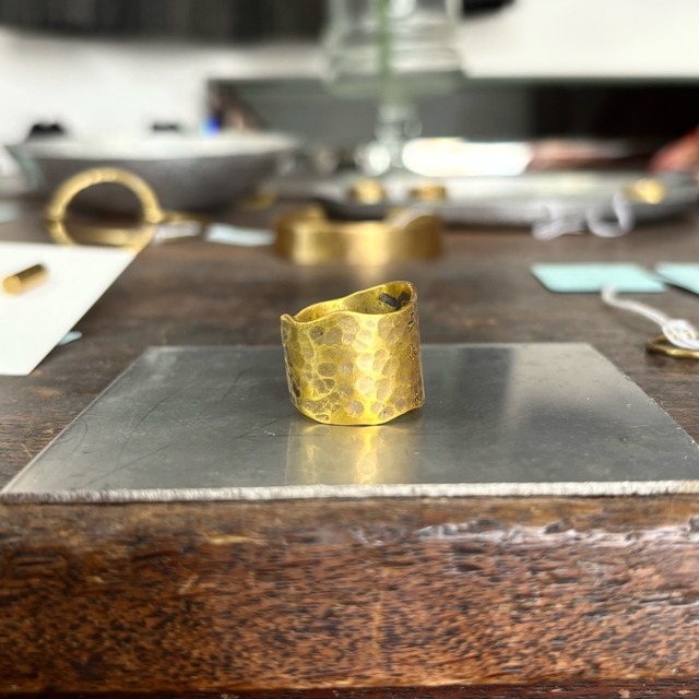 【Brass Ring – 真鍮リング】 フォルムが印象的な真鍮のリング。 表面には槌目(つちめ)模様が施されており、無骨さと繊細さを併せ持った存在感のある一点です。 真鍮ならではの深みのある輝きに加え、うっすらと色づいた表面も特徴のひとつ。 ※この色味は、貴金属用クロスなどで磨くと落ちてしまうため、現在の風合いをそのままお楽しみいただくのがおすすめです。 【サイズ】 15号 【素材】 真鍮 【お手入れについて】 真鍮は、空気や肌に触れることで少しずつ色味が深まり、経年変化を楽しめる素材です。 使い込むうちに手の皮脂がなじみ、落ち着いた風合いへと変化していきます。 元の輝きを取り戻したい場合は、貴金属用クロスやセーム革(鹿皮など)でやさしく拭くことで、表面の酸化膜を取り除くことができます。 ※ただし、色づいた風合いを保ちたい場合は、磨きすぎにご注意ください。 真鍮ならではの味わいの変化を、ぜひ長くお楽しみください。 —— 作家:Naruse Eri Instagram:@itoeri1982