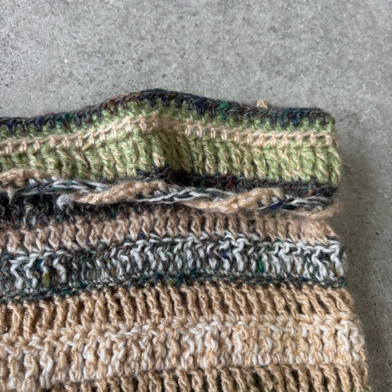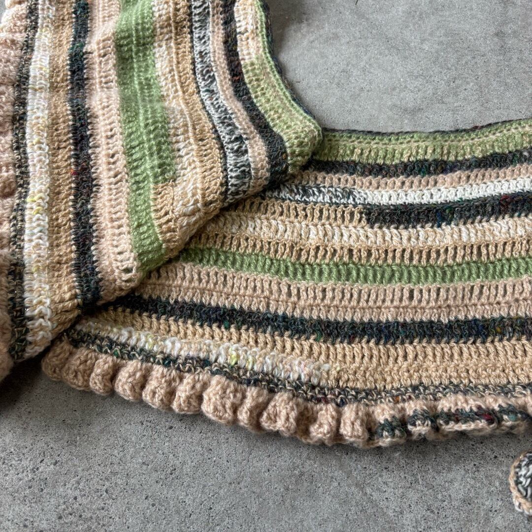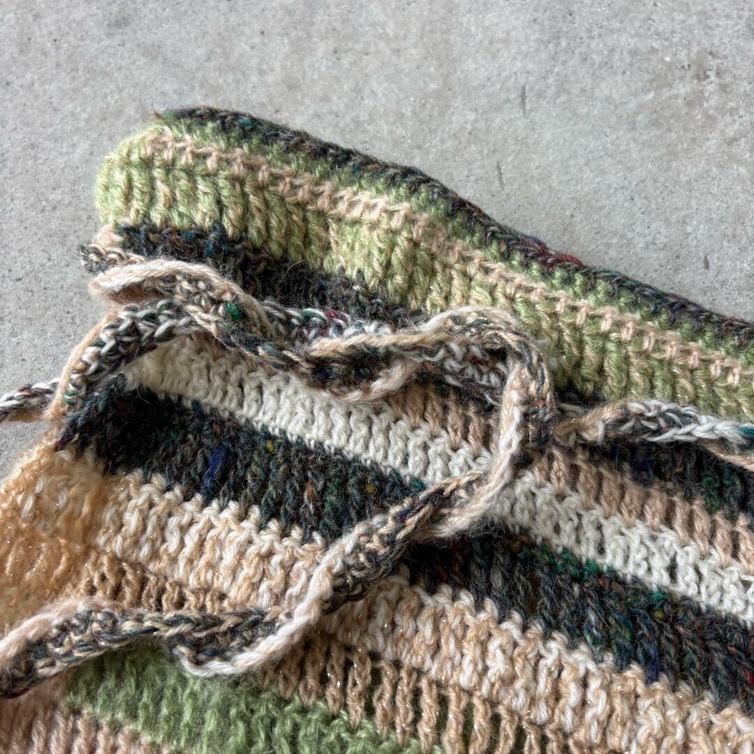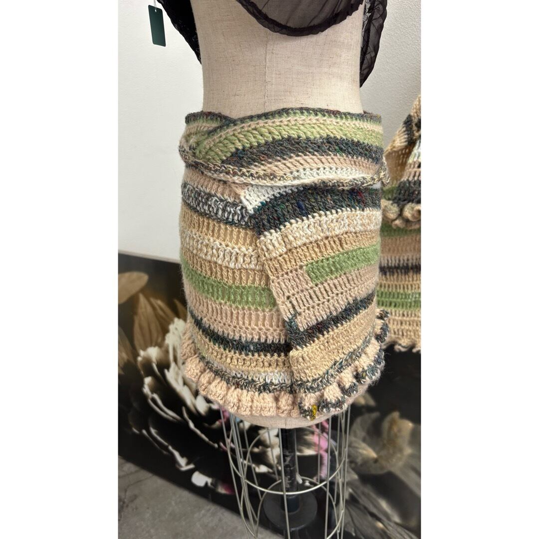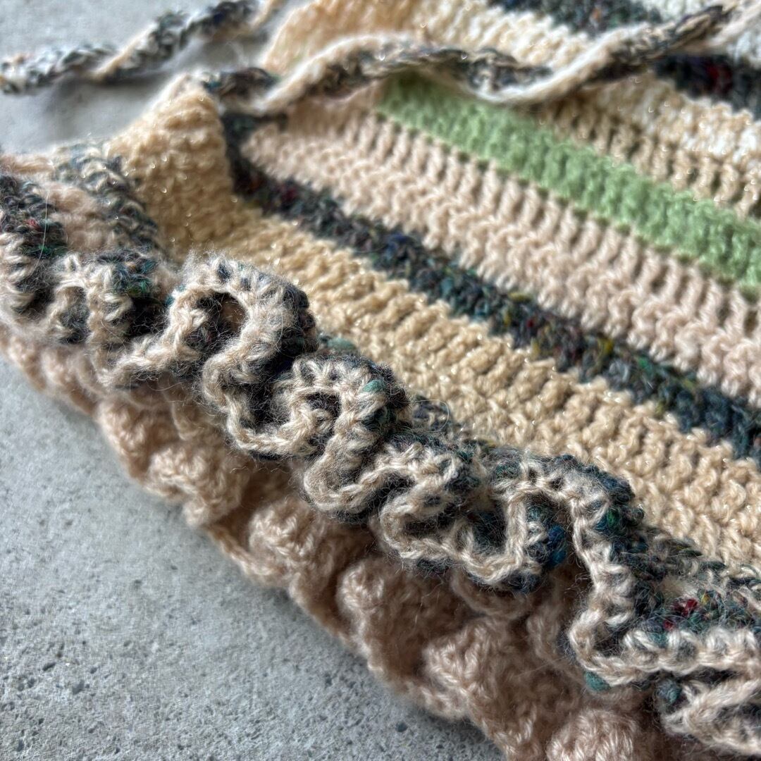 手編みのミニ丈ラップスカート。ベージュ、グリーン系のカラーを中心に白やシルバーのラメ糸をmixし編みました。体に綺麗に沿うように全体的に細めの糸で編み、裾は太めの糸でフリルを編みました。