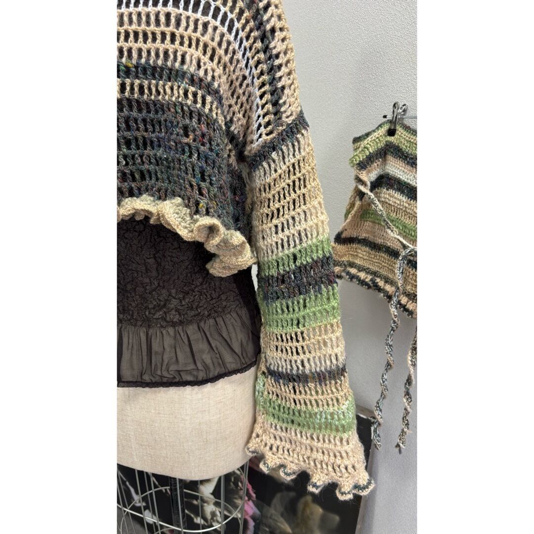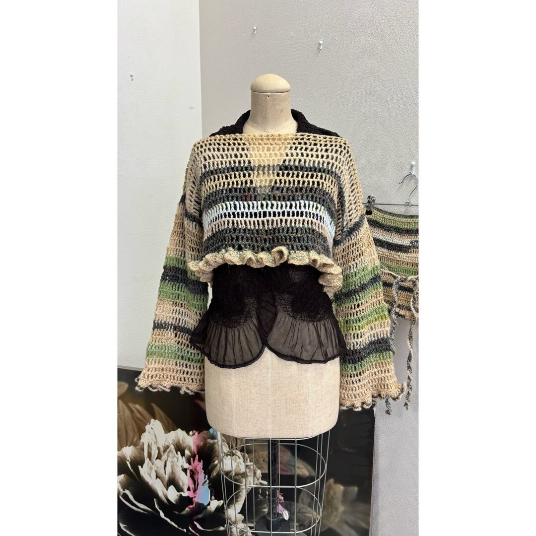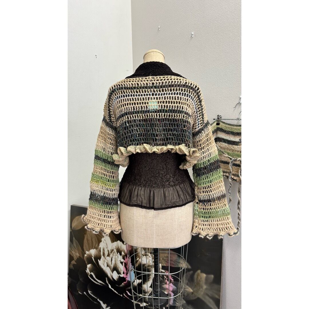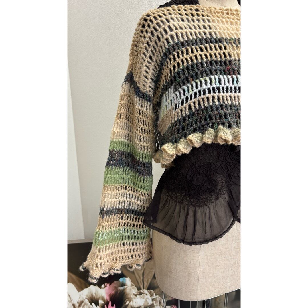 手編みのクロップドトップス。ベージュとグリーン系のカラーを中心に白とメタリックな糸をmixし編みました。着丈は短く、袖は裾にかけて広がるデザインに程よいボリュームのフリルがポイントです。落ち着いたカラーに女性らしさを出すために裾にフリルを施しました。甘く目立ち過ぎないようボリューム感と配色にこだわりました。下に重みがあることで体にフィットしてくれ着ていて浮いてこないのも良いポイントです。シャツなどとレイヤードしても膨らまず、体を綺麗に見せてくれます。