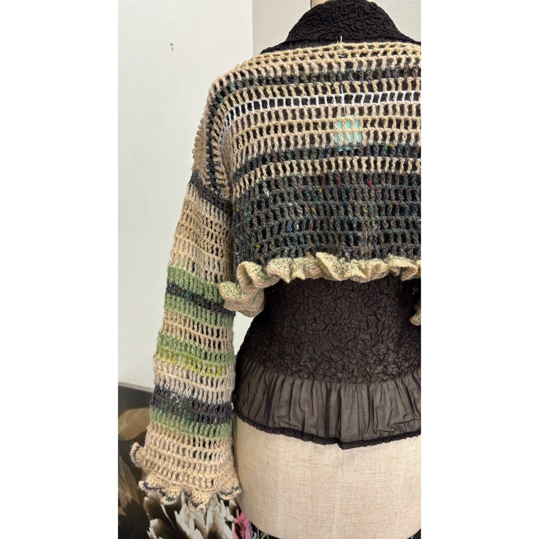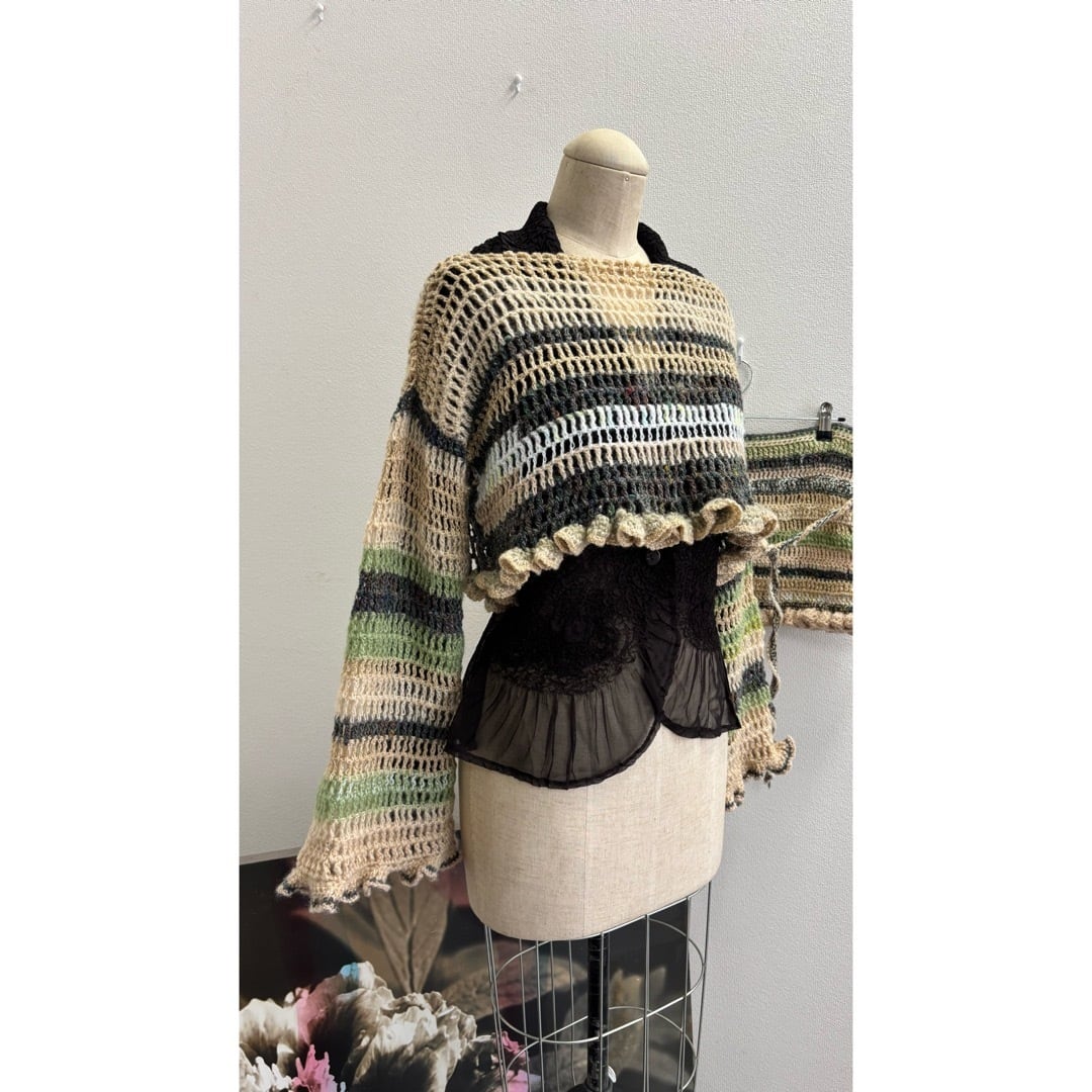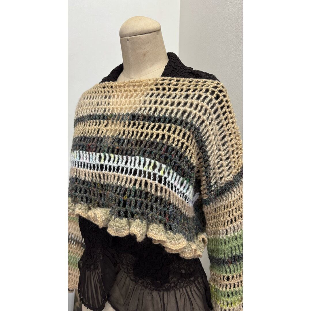 手編みのクロップドトップス。ベージュとグリーン系のカラーを中心に白とメタリックな糸をmixし編みました。着丈は短く、袖は裾にかけて広がるデザインに程よいボリュームのフリルがポイントです。落ち着いたカラーに女性らしさを出すために裾にフリルを施しました。甘く目立ち過ぎないようボリューム感と配色にこだわりました。下に重みがあることで体にフィットしてくれ着ていて浮いてこないのも良いポイントです。シャツなどとレイヤードしても膨らまず、体を綺麗に見せてくれます。