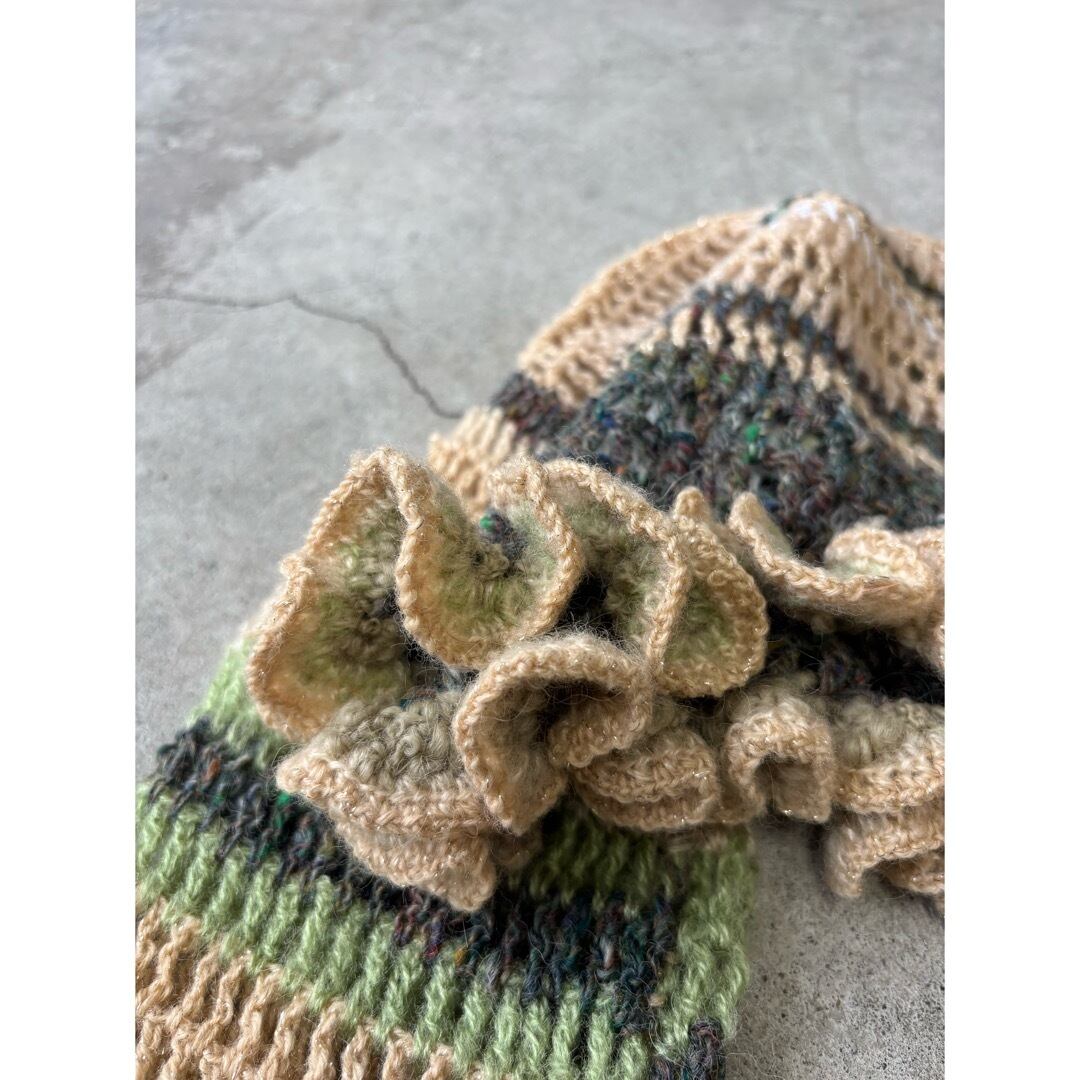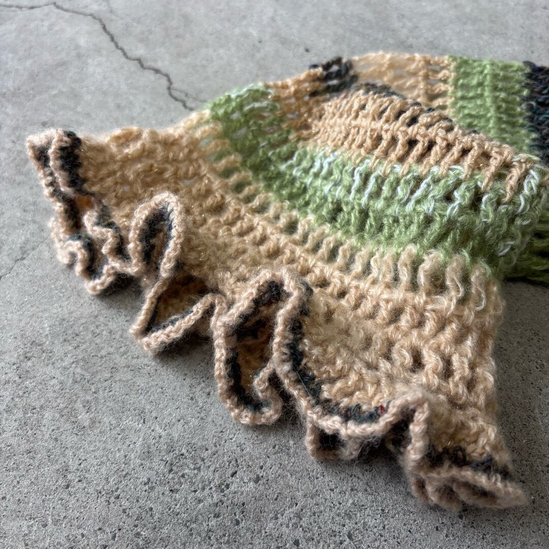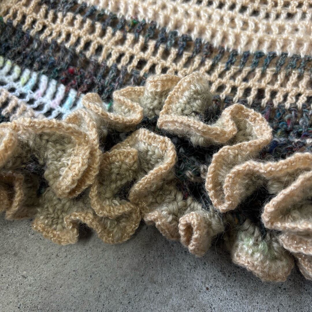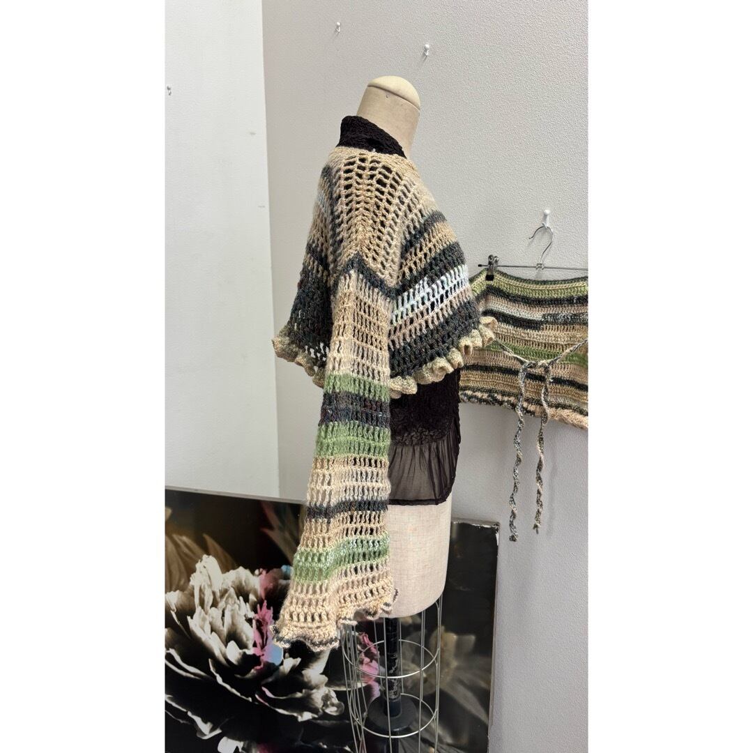手編みのクロップドトップス。ベージュとグリーン系のカラーを中心に白とメタリックな糸をmixし編みました。着丈は短く、袖は裾にかけて広がるデザインに程よいボリュームのフリルがポイントです。落ち着いたカラーに女性らしさを出すために裾にフリルを施しました。甘く目立ち過ぎないようボリューム感と配色にこだわりました。下に重みがあることで体にフィットしてくれ着ていて浮いてこないのも良いポイントです。シャツなどとレイヤードしても膨らまず、体を綺麗に見せてくれます。