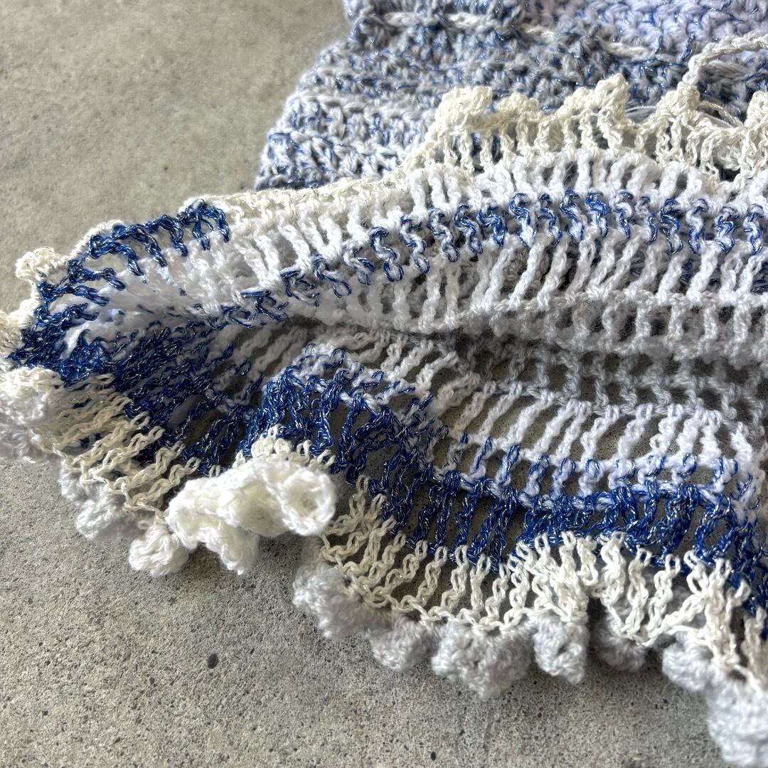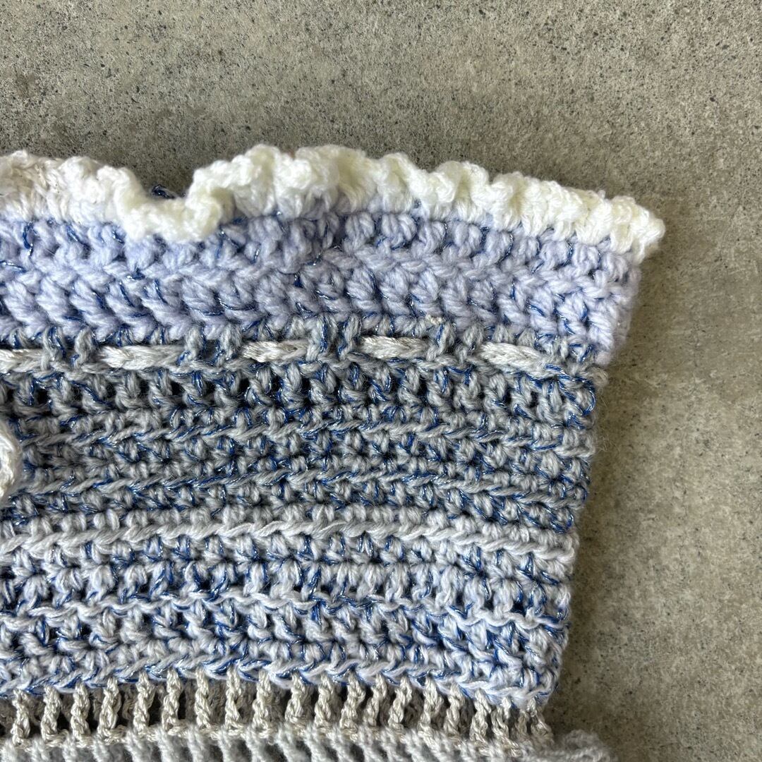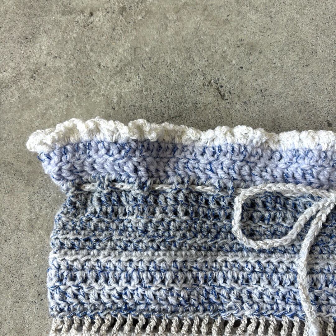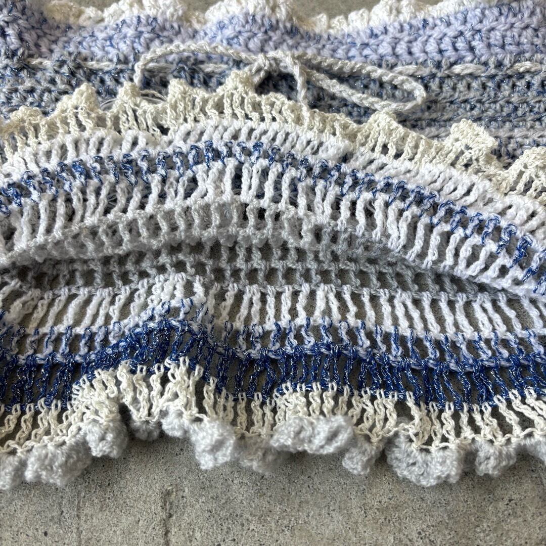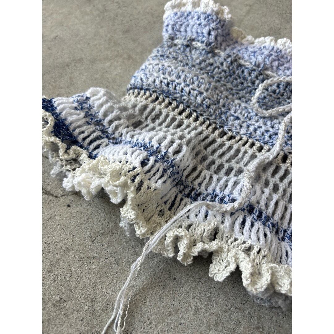 手編みのビスチェ、ミニスカート。2wayでお使いいただけます❤︎ブルーラメ、白、水色の糸を使用し編みました。重たくならないよう細めの糸で、裾はさらに細い糸でフリルを施しました。 上部の紐は体に合わせて調節可能です♡