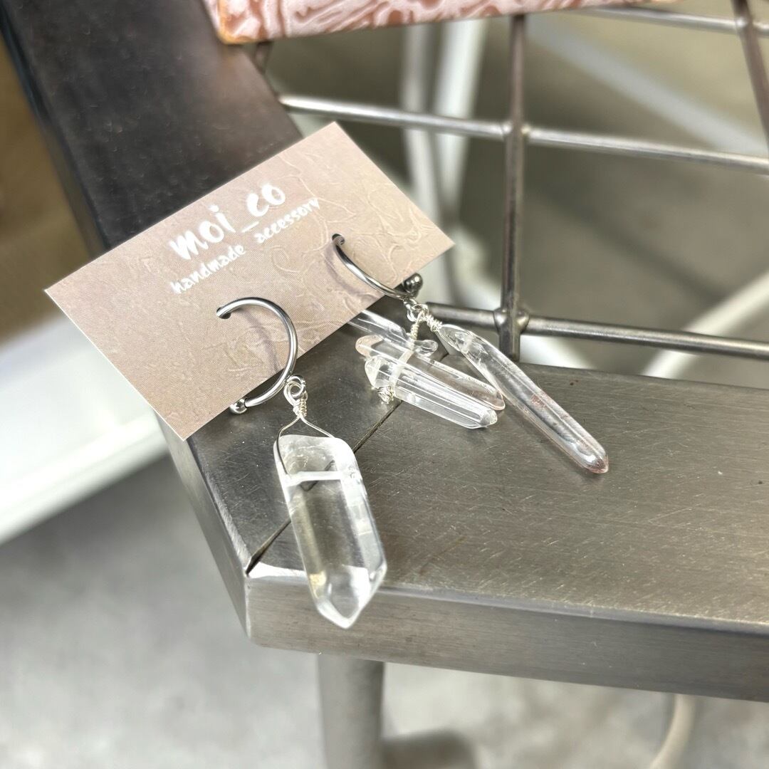 天然の水晶を使った、アシンメトリーデザインの一点ものピアス。