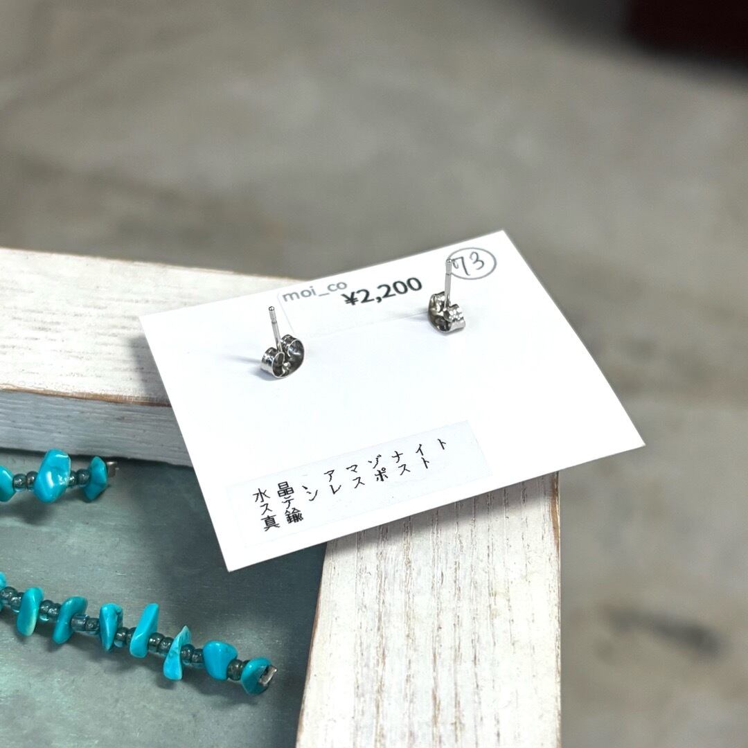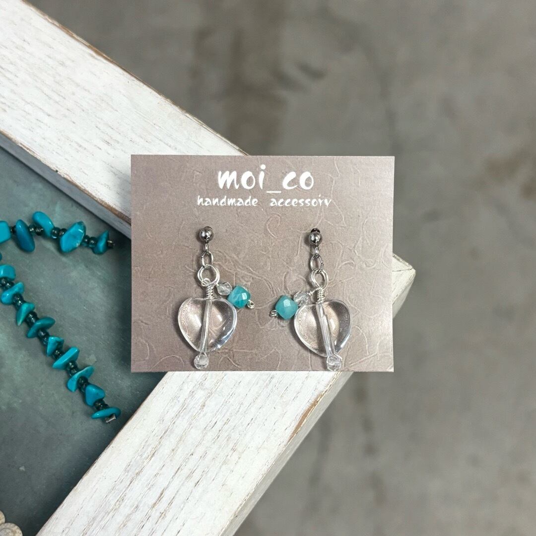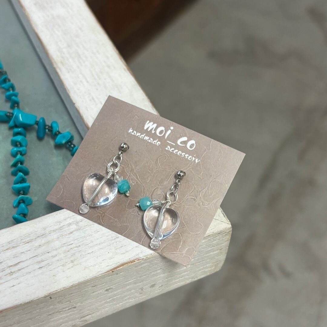 素材:水晶(天然石/ハート型)、アマゾナイト、ステンレスポスト、真鍮