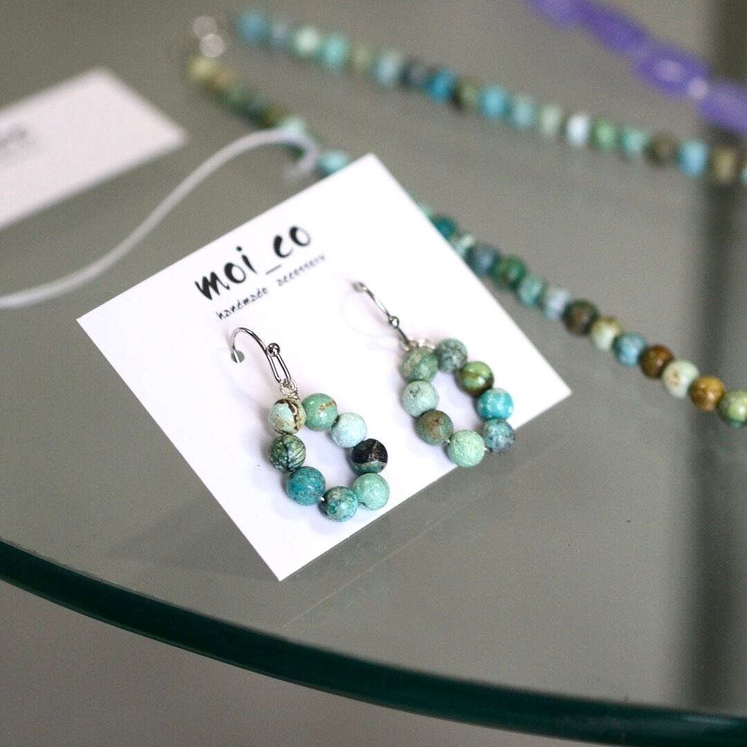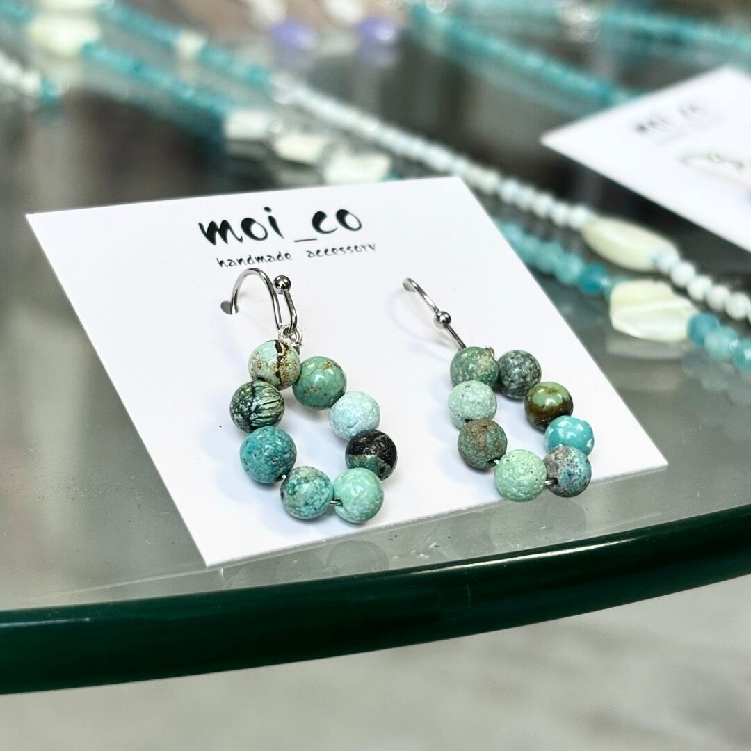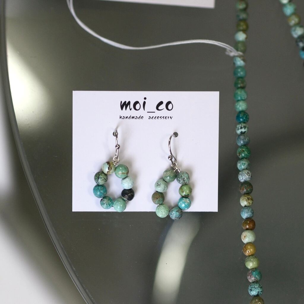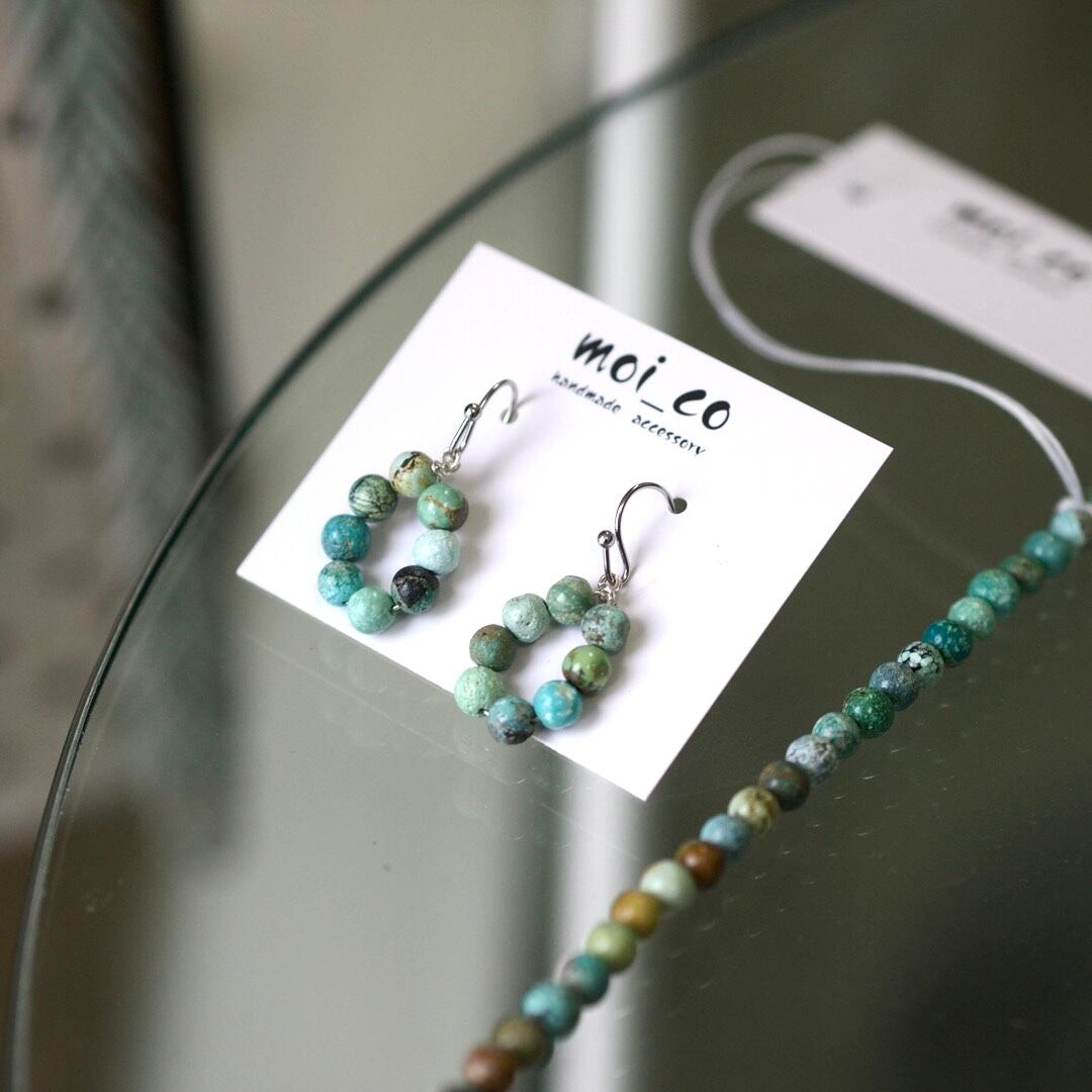 8粒のターコイズをぐるりと並べた、輪っかが印象的なピアス。爽やかな存在感を添えてくれます。
