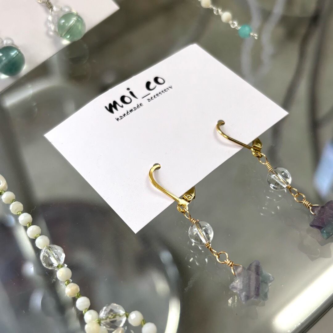 淡い紫のフローライトを星形にカットした、やさしい輝きの揺れるピアス。