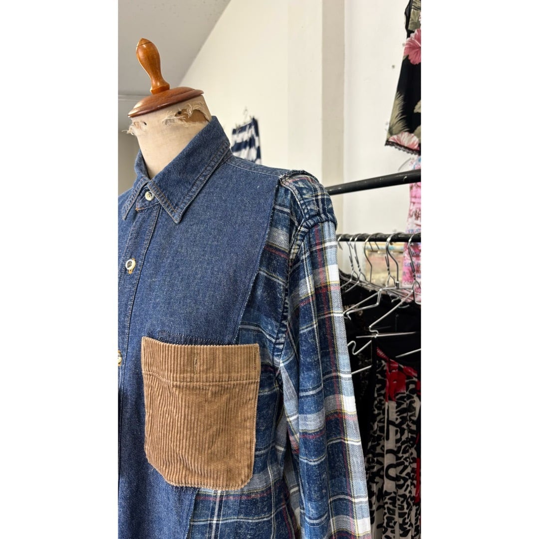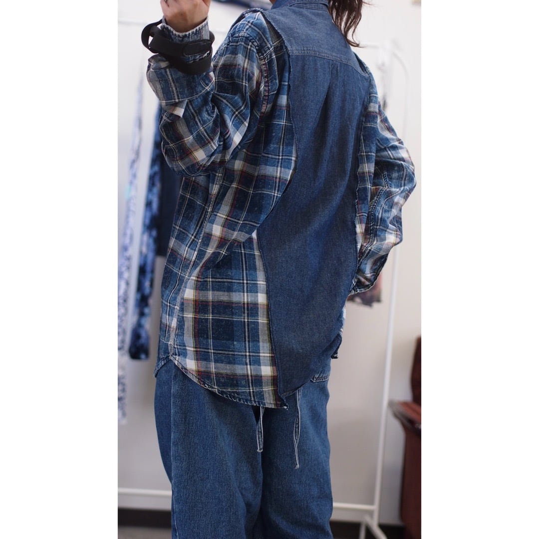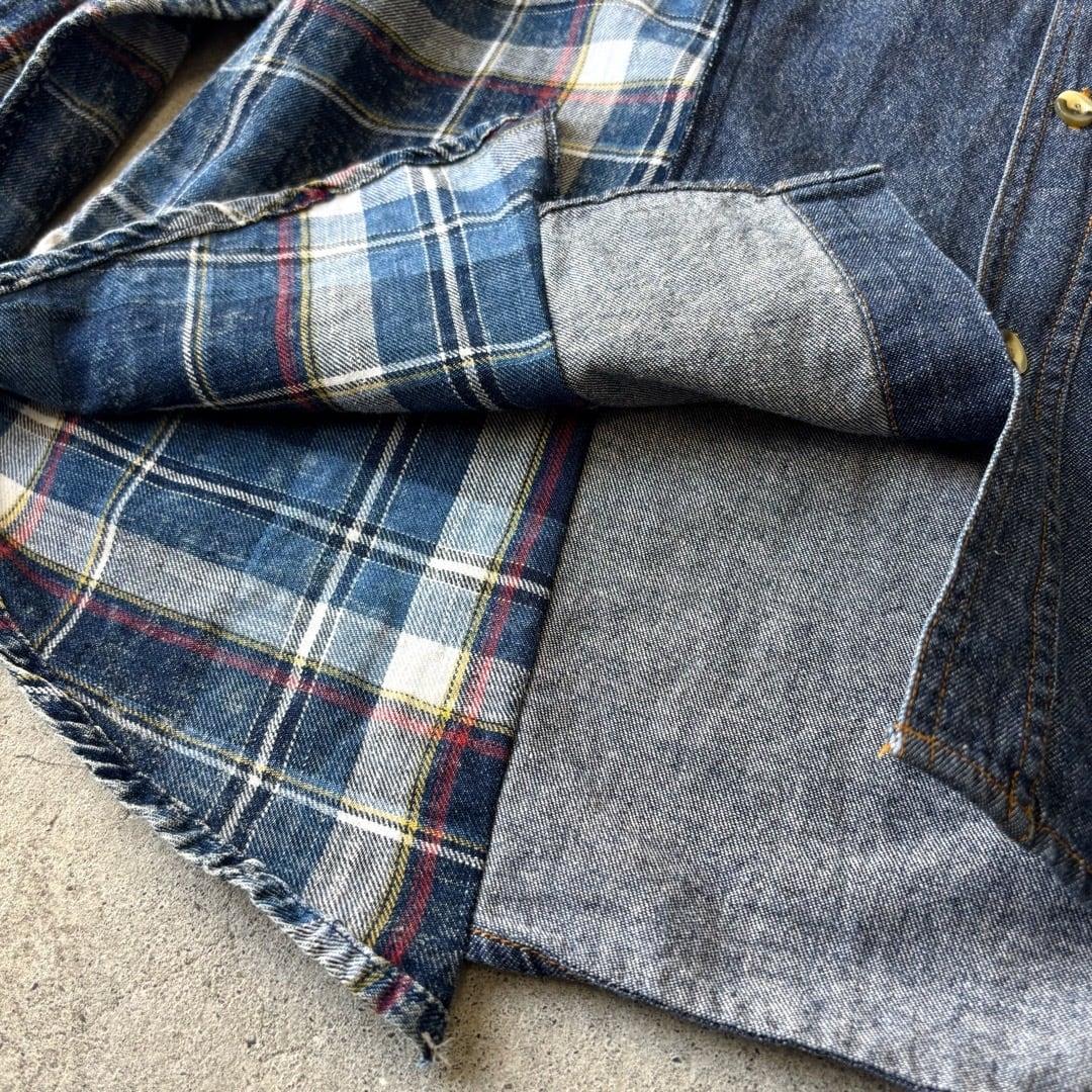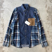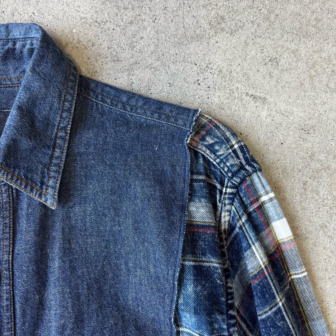 ユーズド加工が施されたチェックシャツとダンガリと組み合わせた、1点もののドッキングしたリメイクシャツ。