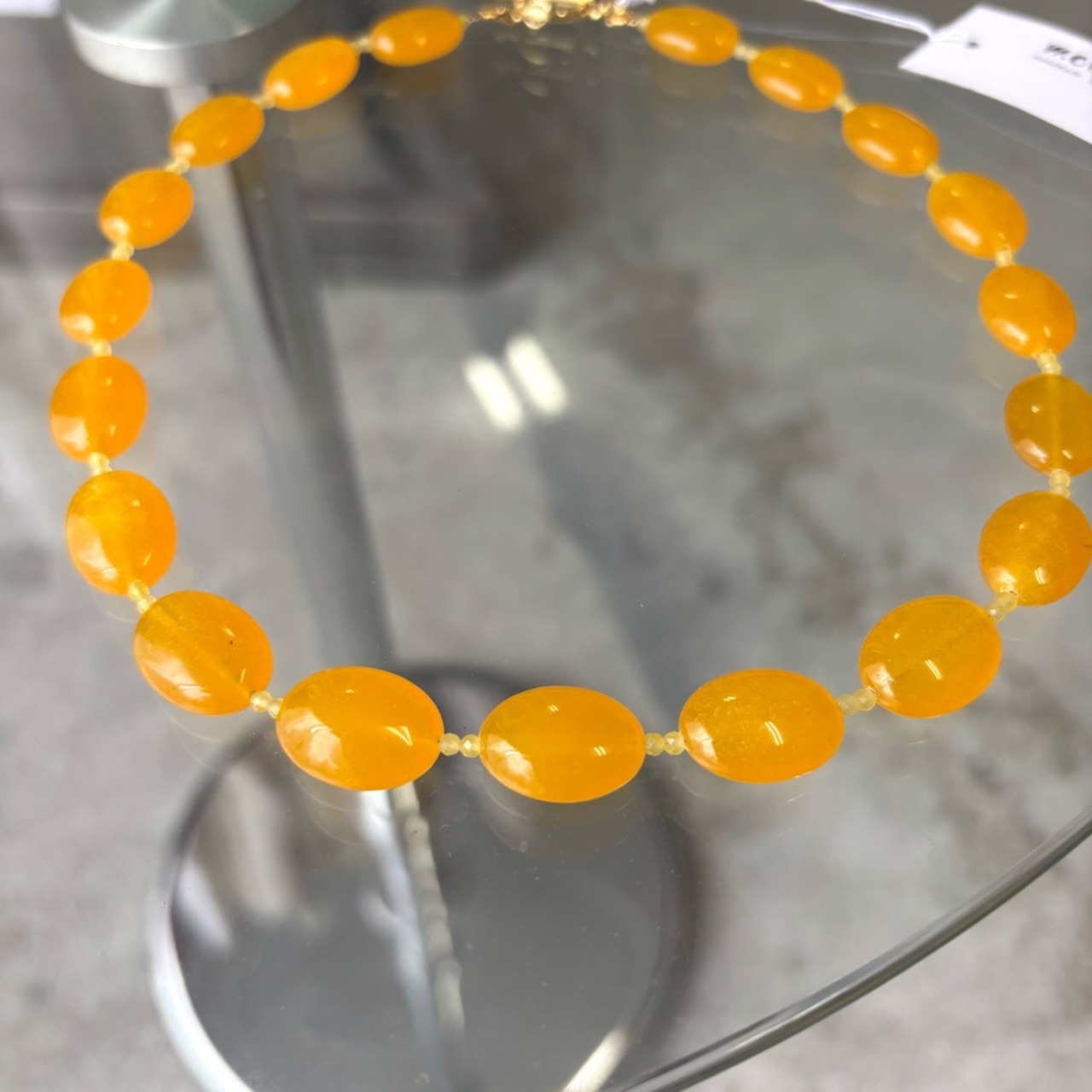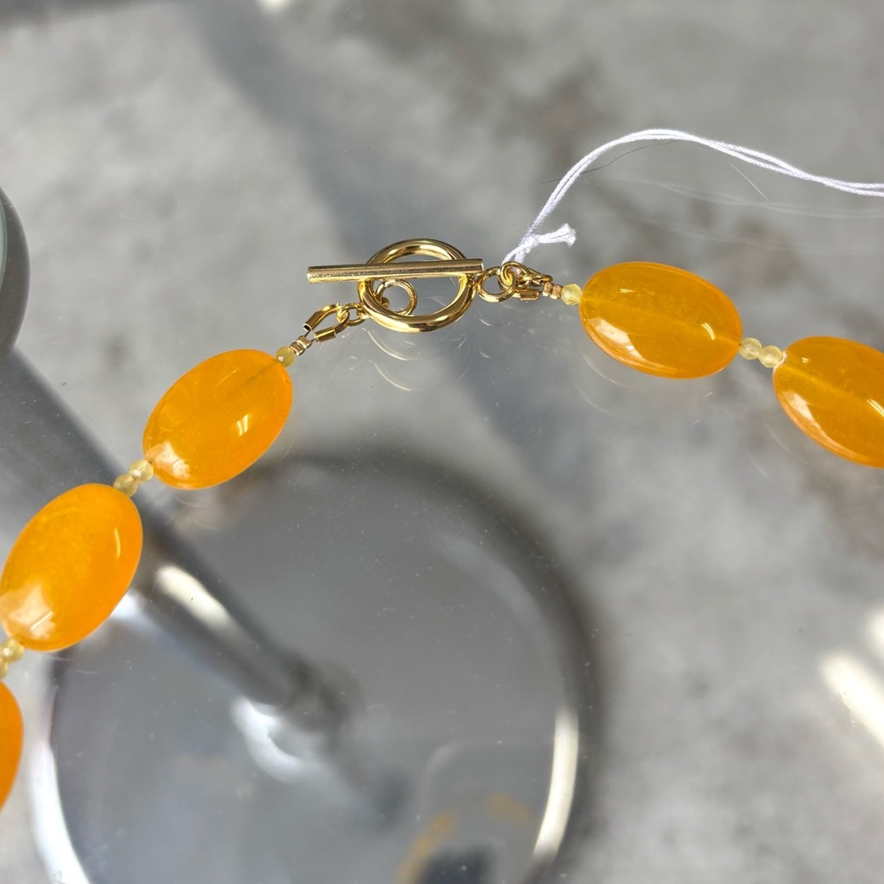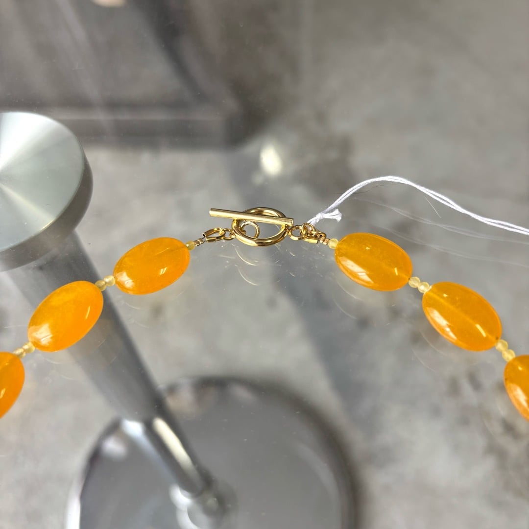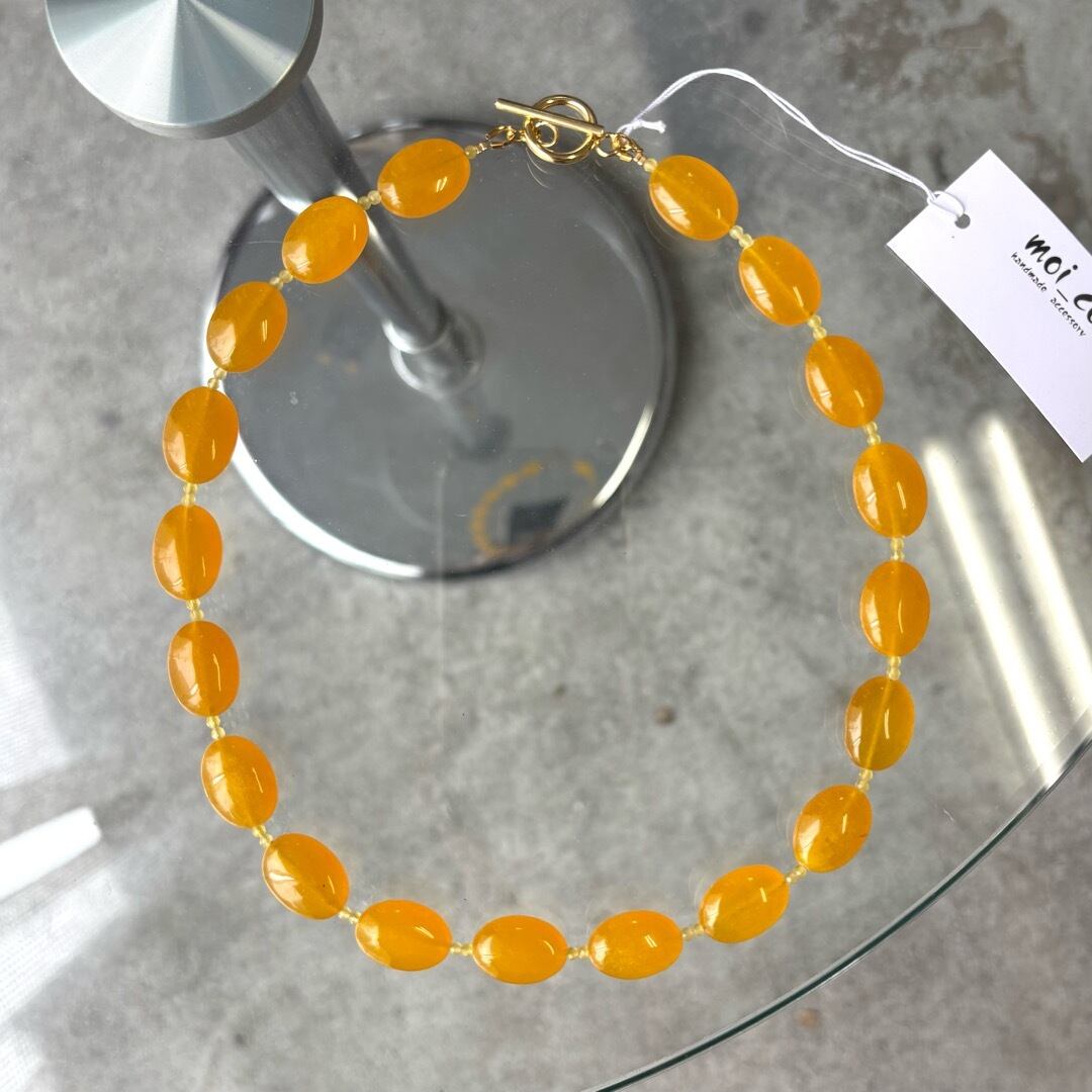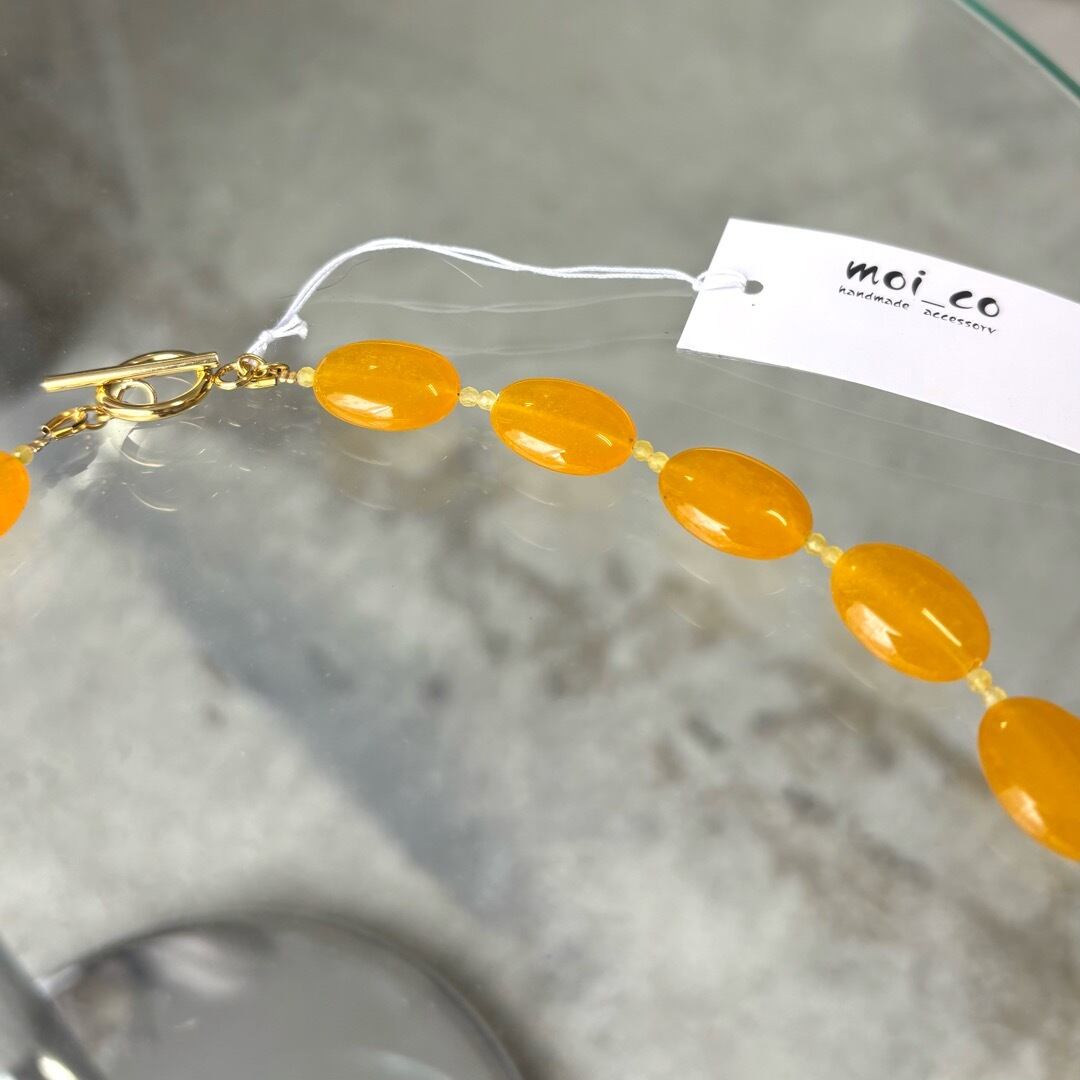 淡いイエローの染めカルセドニーと、あたたかみのあるイエローアゲートを組み合わせたネックレス。