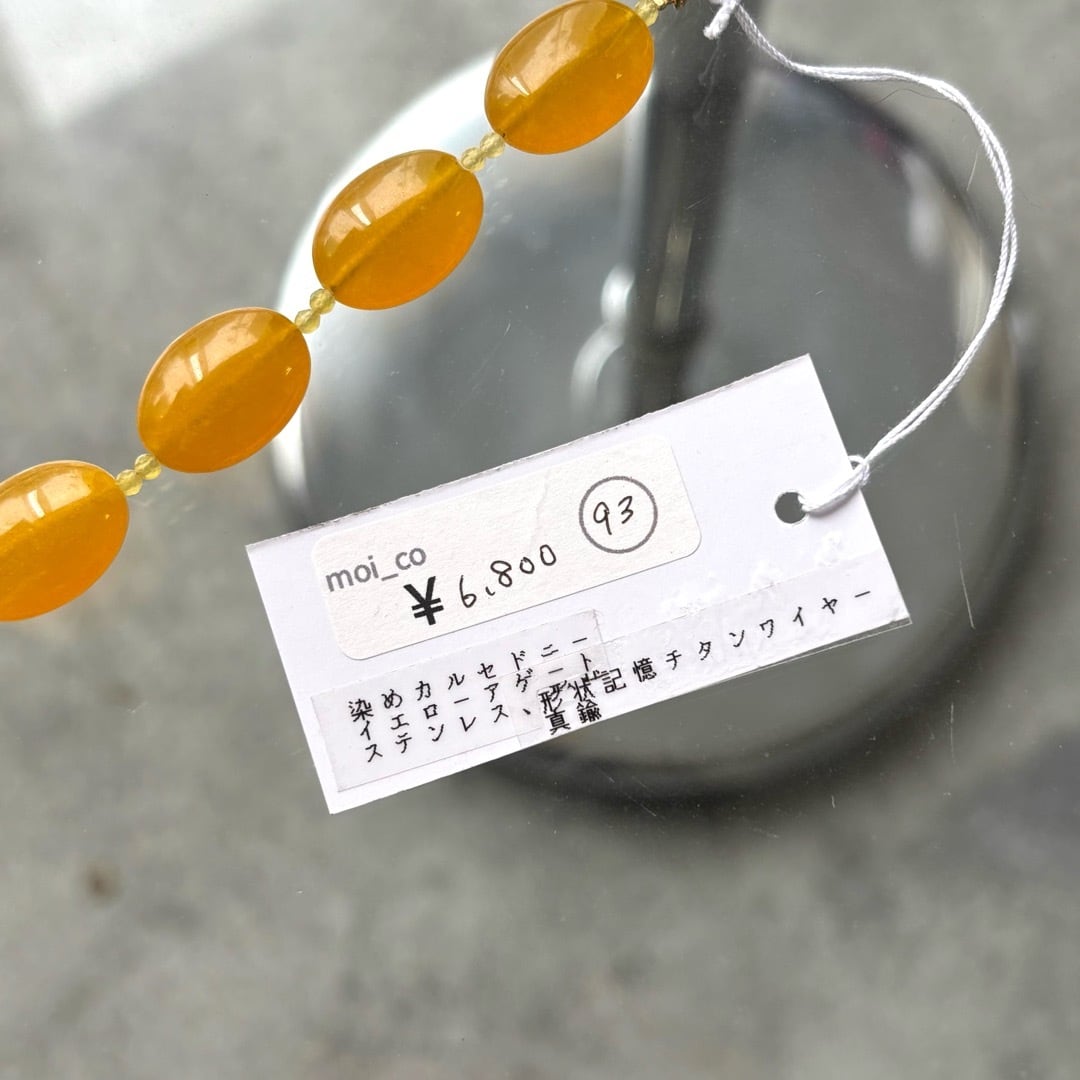 染めカルセドニー、イエローアゲート、ステンレス、真鍮、形状記憶チタンワイヤー