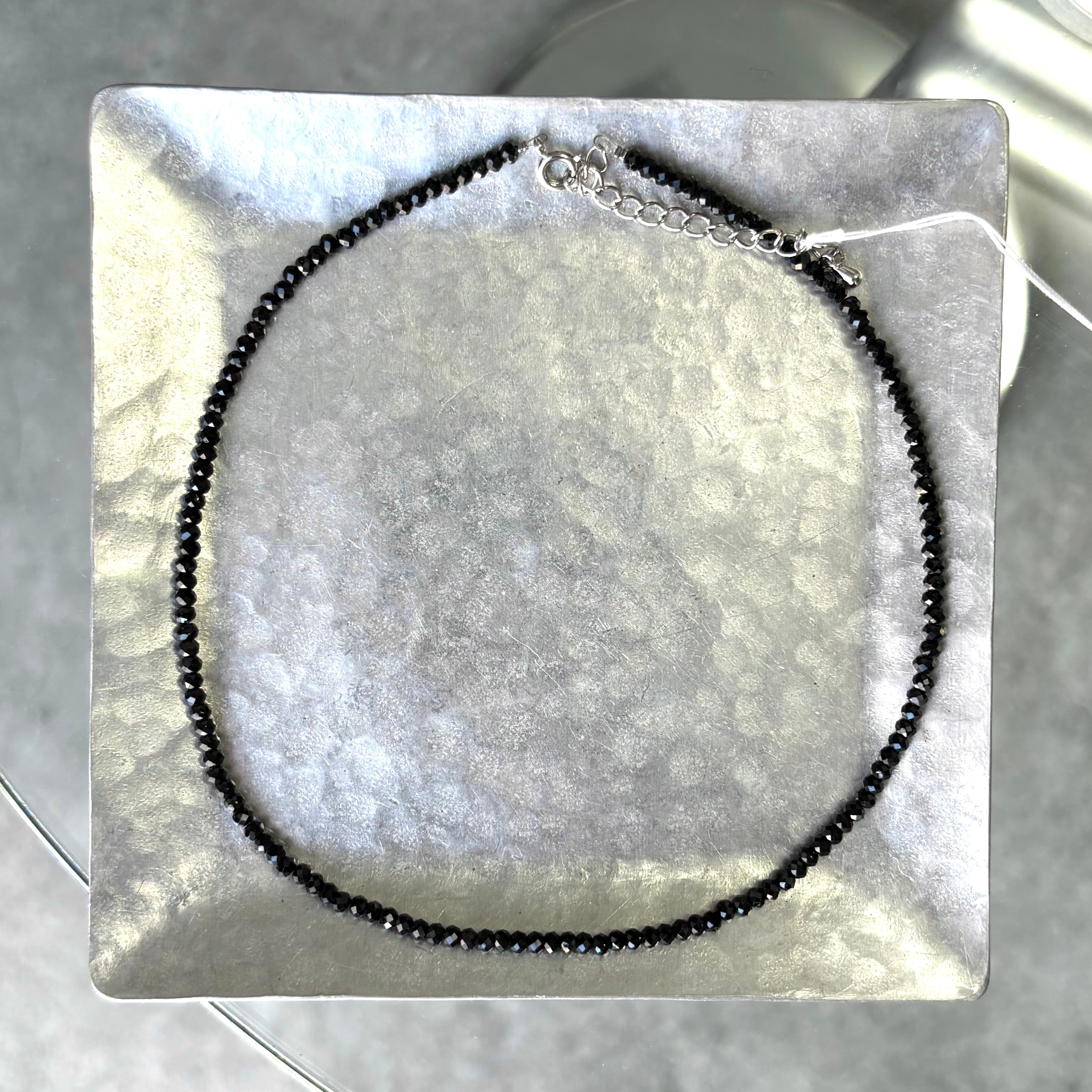 深いブラックが印象的なブラックスピネルを連ねたチョーカーネックレス。