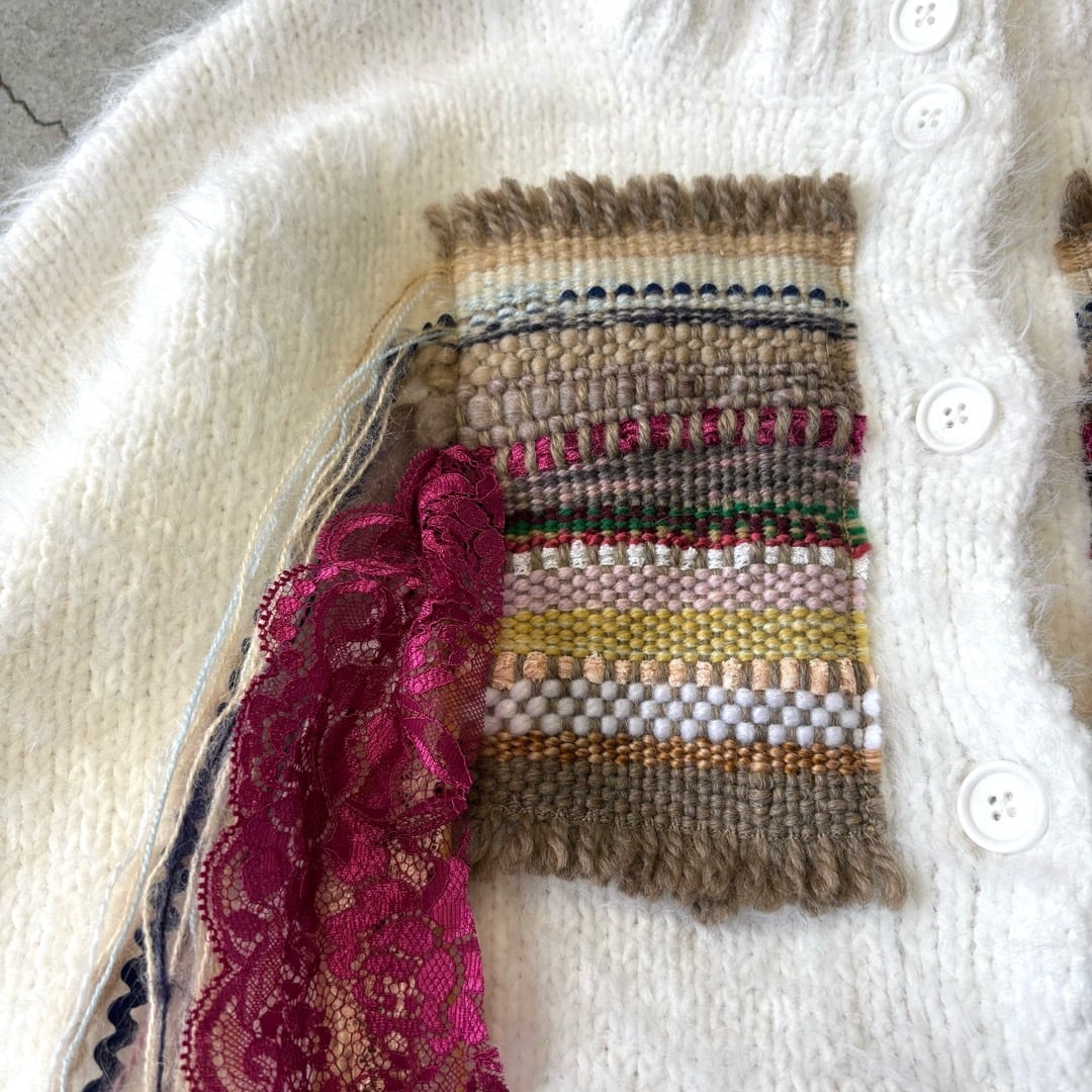 ニットの色合いに合わせて、織り機で一つひとつ丁寧に織り上げた生地を使用。